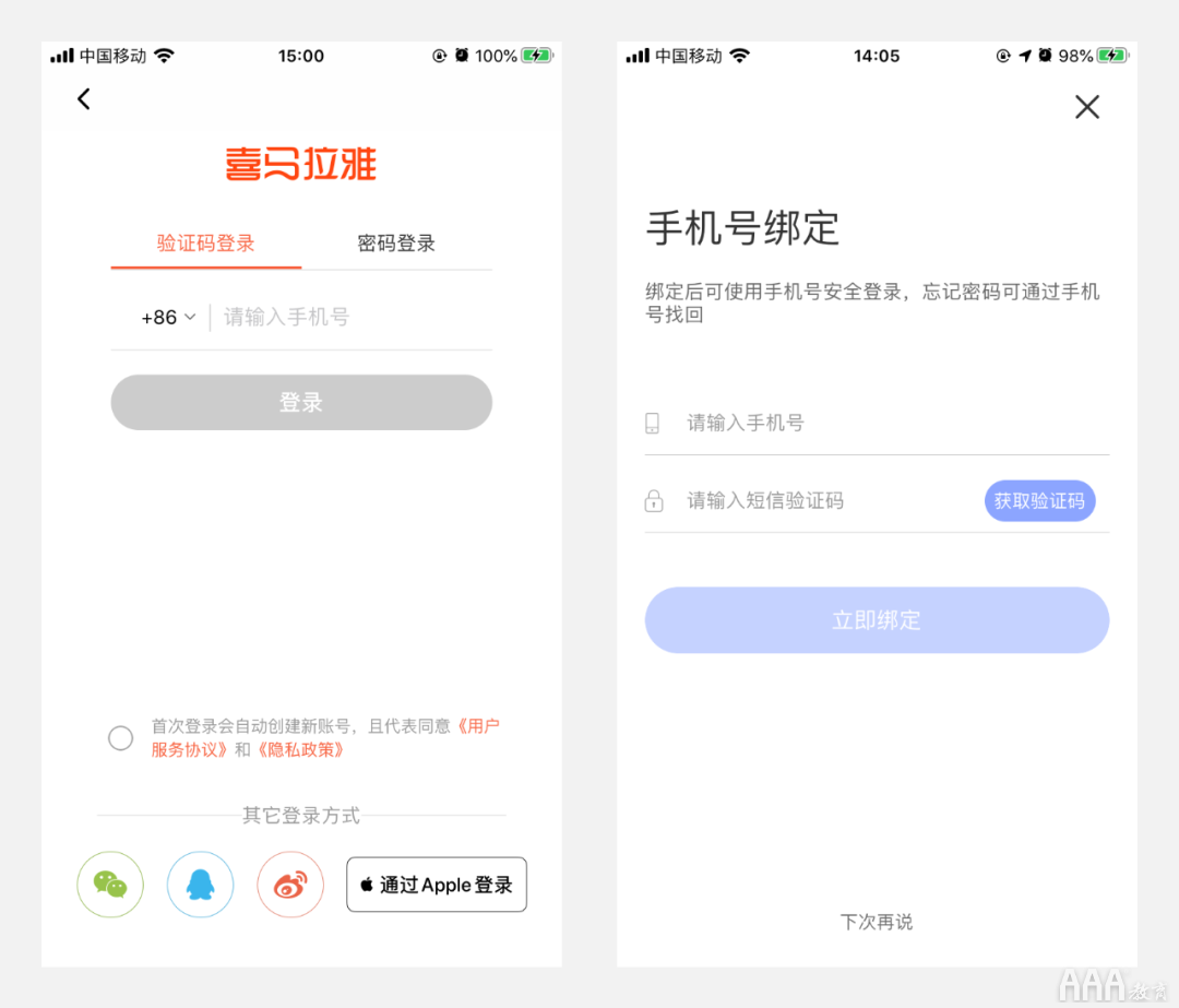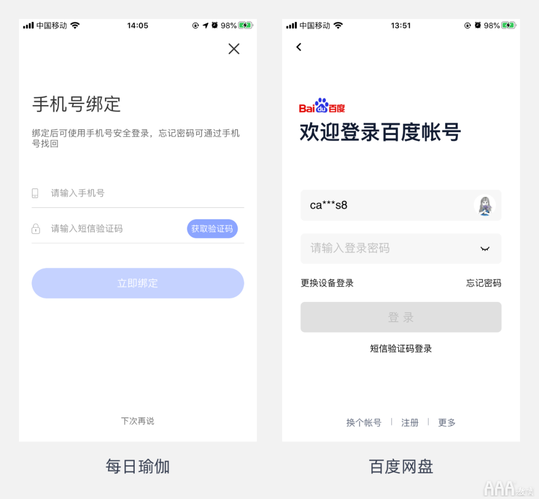 手机号+验证码是比较简便的登录方式,手机号+密码是比较常用的登录方式。在输入手机号后,为了让用户查看是否输入正确,建议手机号显示样式为3-4-4模式(如186 3464 ****)
