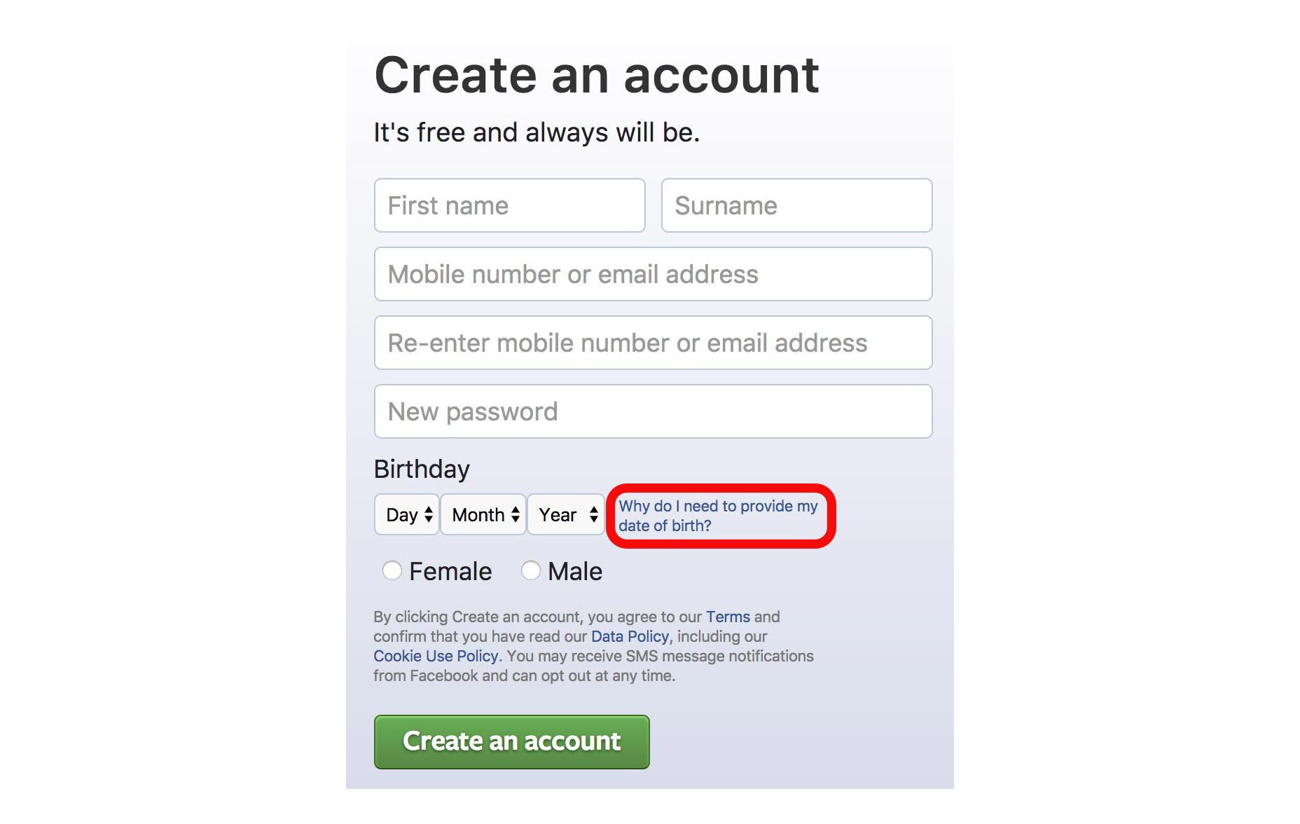 绝大多数用户并不希望提供他们的个人信息,尤其是在他们觉得没有必要的时候。所以,有必要向用户解释为什么需要用户的信息,以及简单阐述如何保护用户数据。例如,Facebook 就在注册页面当中,为用户解释了这些个人数据的使用。