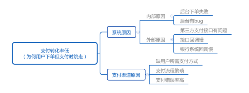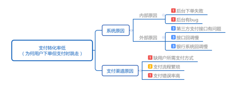思维框架是要素的穷举,并且能站在高层次看清楚要素之间的联系,看清楚要素全貌。在分析问题时候,我们可以用思维框架来铺开整个图谱,看清楚其中的关键。比如如果某商城从下单到支付,转化率很低,那我们可以尝试用思维框架来分析。从各方面找出转化率低的原因。