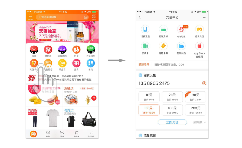(由于项目没上线,不能展示设计稿,所以可以用竞品淘宝的【充值中心】来阐述这个思考过程)
