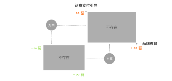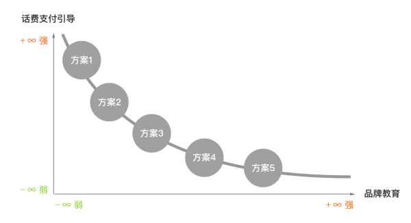 聪明的你一定会发现,既然“话费支付引导”与“品牌教育”是相反的变量,那么完全可以将二维矩阵图变形,变成反比例函数图像。