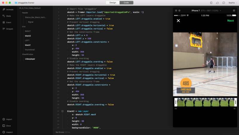Framer的不同之处,它是真的是让设计师去写代码呀,通过代码实现出原型,当然Framer它自己也做了很多的类似于效果包的代码库,设计师只需要调出来进行使用就可以。意思就是,不是每行代码设计师都要敲,Framer是简化后的代码模式软件。还有就是它支持Sketch等文件的导入,也就是说咱们可以在sketch上画好了,再到Framer进行动态效果的呈现,不需要将每个图层都在Framer进行代码实现。(后来验证,画图还是在Framer自己的设计模式进行画实现才比较方便)